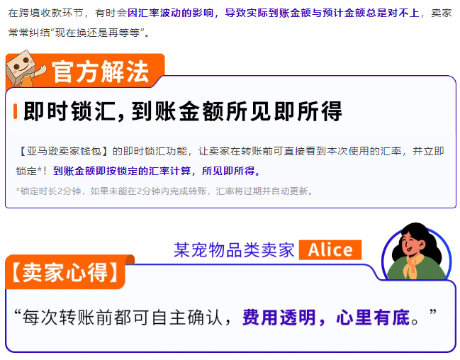 (1)若您希望能灵活持有部分美元收入,同时可按需将部分资金以人民币转入国内银行账户,并支持即时锁汇,根据实时汇率灵活控制货币兑换、提现时间以及金额,且还需要直接向供应商支付款项,推荐使用【亚马逊卖家钱包】