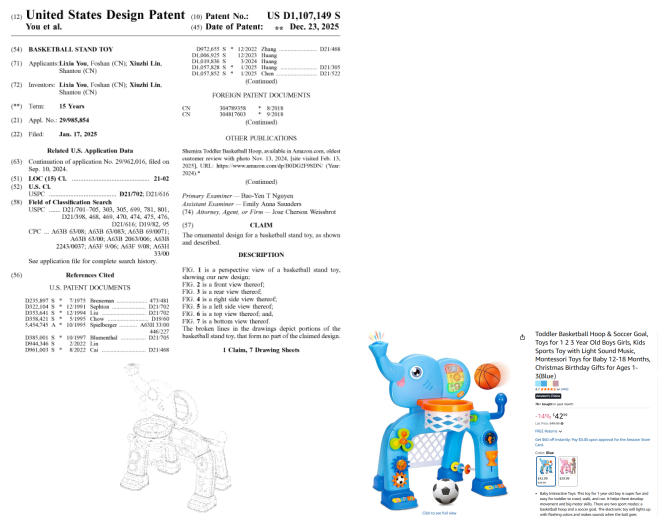 不少篮球架已有美国外观专利,比如以下这款热销产品就于2025年12月23日下证专利,专利名称Basketball stand toy,专利号USD1107149S,2025年1月17日申请: