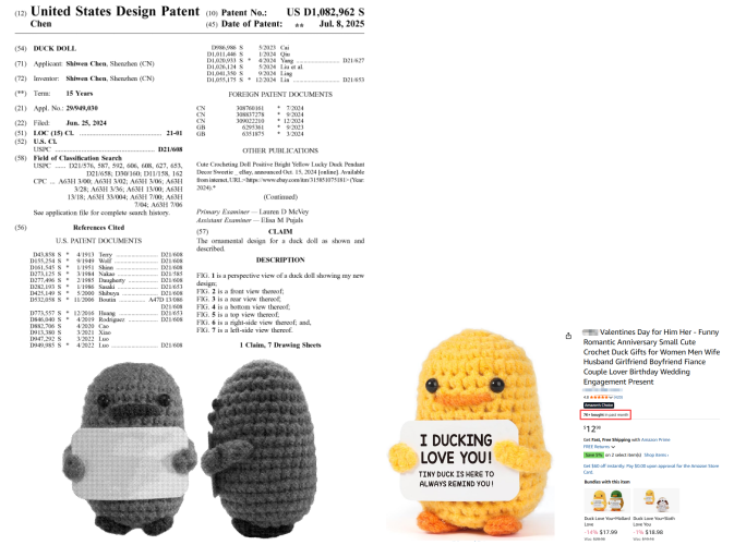 今年针织玩偶外观专利下证堪称“井喷”,其中还有产品刚下证不久便发起TRO维权,比如以下月销7K+的小黄鸭针织玩偶,涉案专利号USD1082962S:
