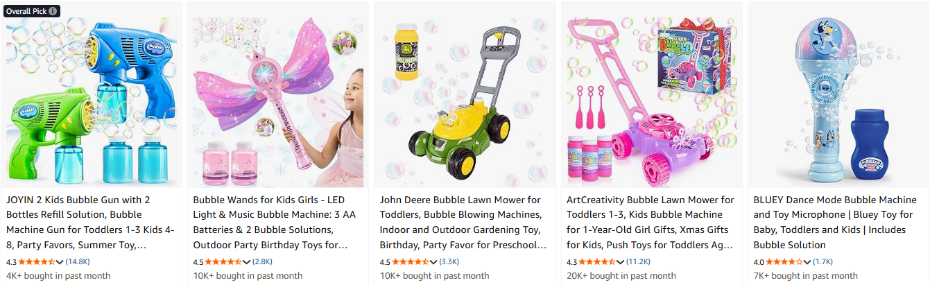 泡泡玩具一向热销,亚马逊美国站有9K+相关listing,其中大批产品月销过千破万,可见具有一定的市场潜力,能出爆款也并不意外。
