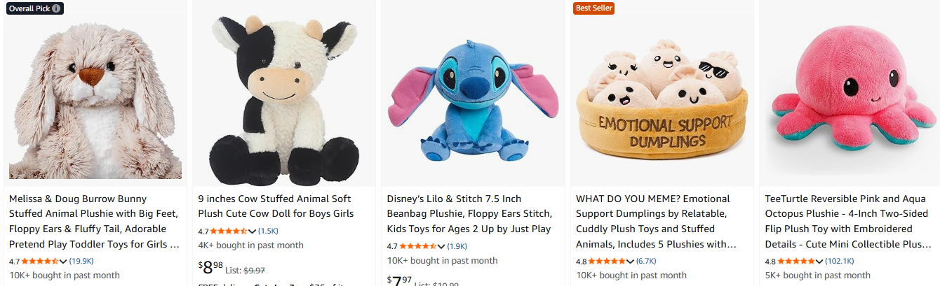毛绒玩具在亚马逊上有10W+相关listing在售,其中不仅出了Squishmallows、TeeTurtle翻面章鱼等爆款,留评月销双双过千的产品也不在少数。