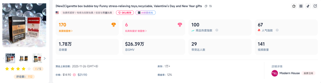 又见爆款!近日一款以香烟为外观设计的泡泡玩具在TikTok美区上走红,上架不到一个月就卖出了1.78万件,累计销售额达26.39万美元(约合人民币186万),相似产品在国内采购平台售价3元左右,说一句赚翻了也不为过~