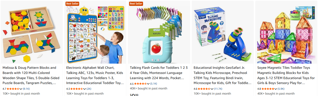益智玩具是一种专门设计于培养儿童注意力、记忆力、以及问题解决能力的玩具,极受家长青睐,亚马逊上月销破万的产品不在少数。