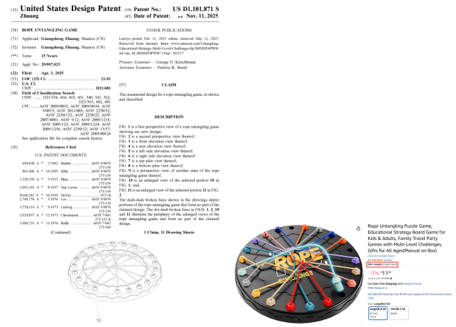 益智玩具有多好卖,卖家的专利布局就有多疯狂,不少爆款都已专利“傍身”。比如以下这款解绳玩具美国外观专利于2025年11月11日下证,专利名称ROPE UNTANGLING GAME,专利号USD1101871S,高度相似产品月销20K+:
