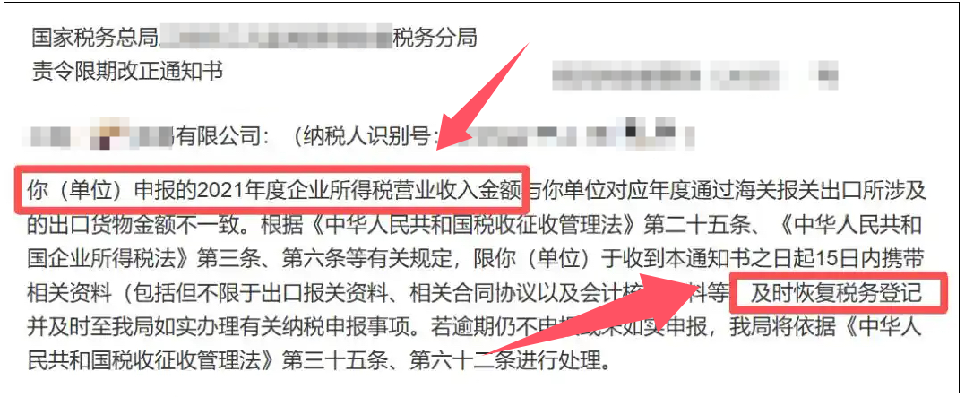 在该通知书中,税局指出:“你公司申报的2021年的年度所得税营业收入金额与你单位对应年度通过海关报关出口所涉及的出口货物金额不一致,根据《中华人民共和国税收征收管理办法》,限你单位于收到本通知书起15日内携带相关材料,及时恢复税务登记并到我局如实办理纳税申报事项。”
