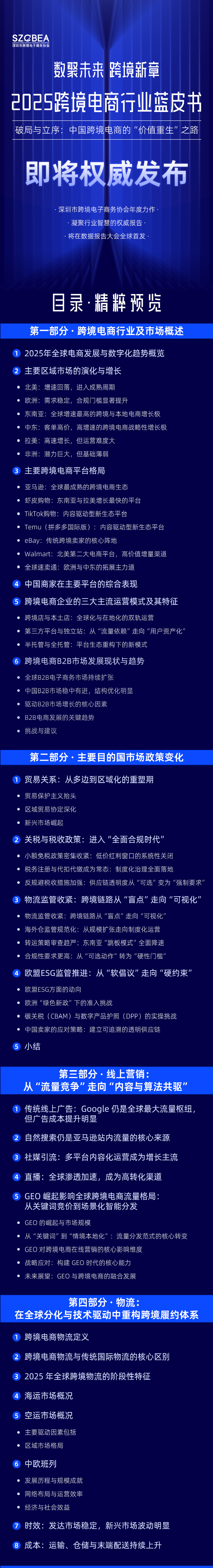 届时,深圳市跨境电子商务协会、深圳市众智跨境电子商务研究院重磅发布《2025年跨境电商行业蓝皮书》: