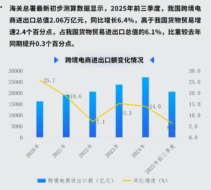 跨境电商等新业态蓬勃发展,成为外贸稳增长的重要引擎。海关总署初步测算,今年前三季度,我国跨境电商进出口额约2.06万亿元,同比增长6.4%,占同期货物贸易总值的6.1%。这些数据印证着跨境电商作为外贸稳增长重要引擎的强劲韧性,也预示着行业将迈入更高效、更个性、更包容、更可持续的新阶段。