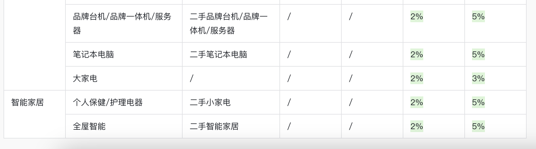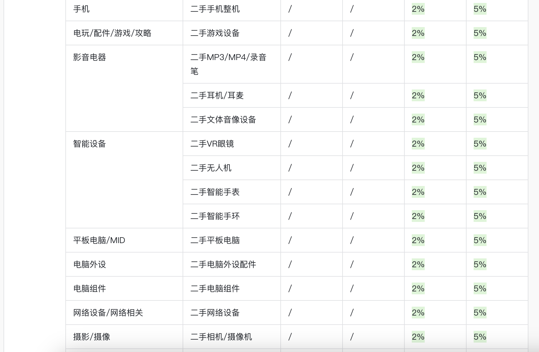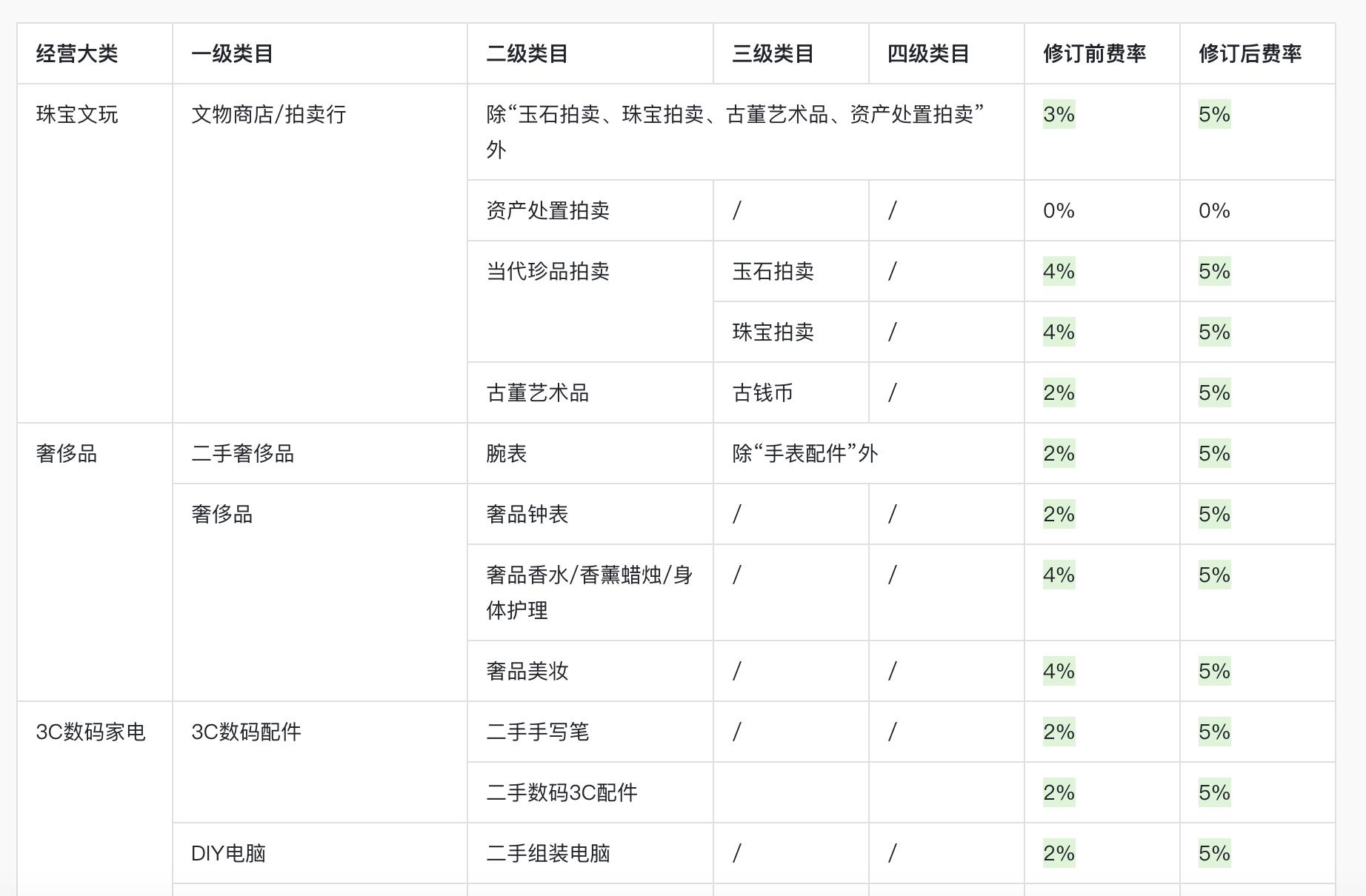此次费率调整主要涉及二手相关品类。具体变动包括:珠宝文玩大类下的“玉石拍卖”费率从4%上调至5%;奢侈品大类下的“奢品钟表”费率从2%上调至5%。在3C数码家电行业,二手手写笔、二手数码3C配件、二手组装电脑等二级类目的费率也从2%提高至5%。