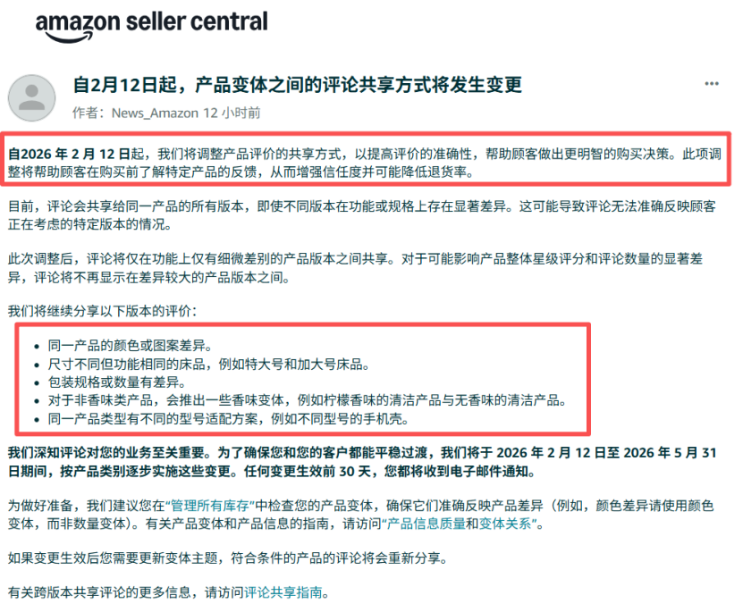 如今,新的政策正式落地,2月12日之后,不符合规定的变体评论将不会共享,而且此次针对的是全品类!亚马逊在公告中还提到:“为了确保您和您的客户都能平稳过渡,我们将于2026年2月12日至2026年5月31日期间,按产品类别逐步实施这些变更。任何变更生效前30天,您都将收到电子邮件通知。”