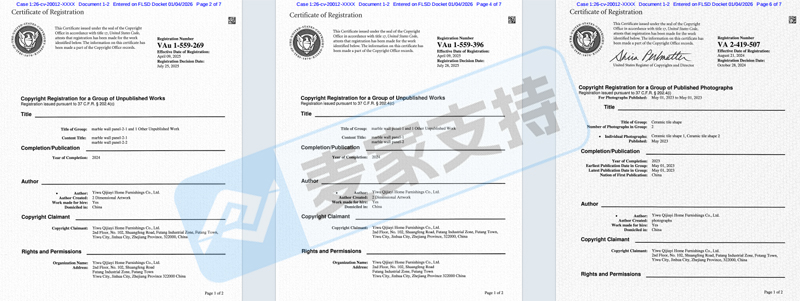 本案是kemet 律所代理义乌出海企业Yiwu Qijiayi Home Furnishings Co., Ltd. 发起的版权维权案件,涉案版权号为:VAu 1-559-269、VAu 1-559-396和VAu 2-419-507等三个作品,目前版权图片仍处于密封状态,但麦家支持通过其对外网站找到了版权涵盖的跨境热销瓷砖图案以及大理纹图案作品,并结合各电商平台的同类产品的展示情况推测,维权细节大概率是针对其销售展示图的盗用情况,有销售此类产品的卖家可参考相关图片排查避雷!目前该案件仍处于前期立案阶段,暂未获批TRO临时限制令,跨境卖家可提前排查,做好应对措施!