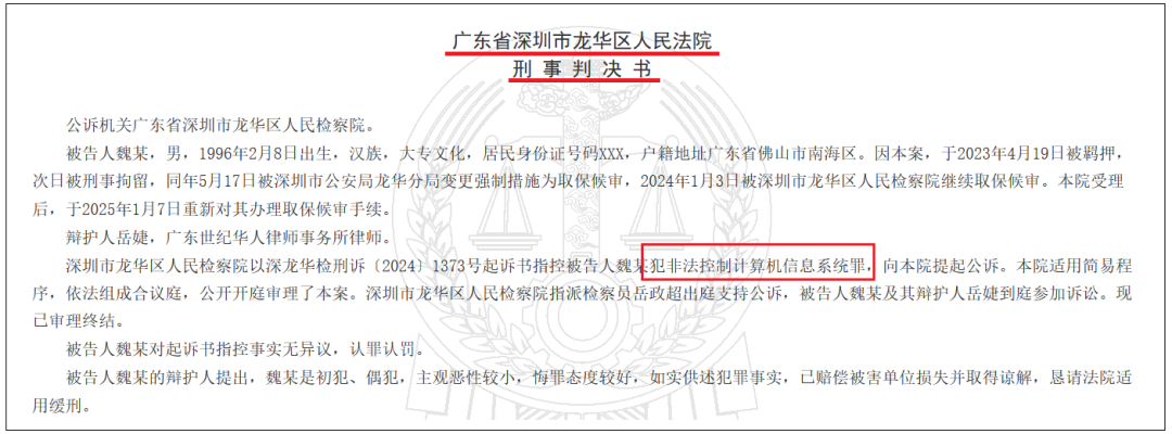 深圳市龙华区人民法院在审理后认为,被告人魏某违反国家规定,侵入计算机信息系统并对该计算机信息系统实施非法控制,情节特别严重,其行为已构成非法控制计算机信息系统罪。