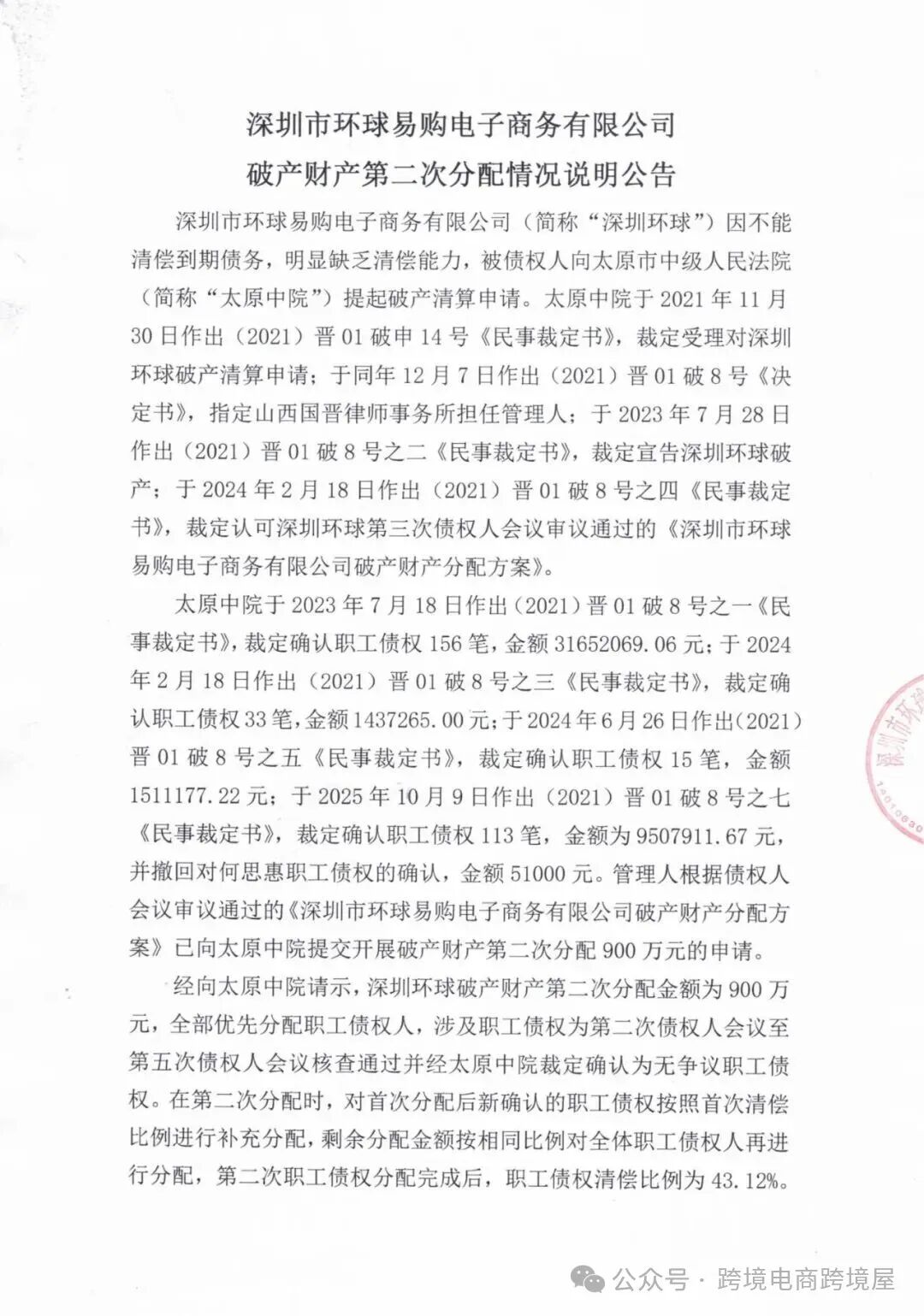 最近,深圳环球易购破产清算管理人,山西国晋律师事务所,发布公告,对深圳环球易购电子商务有限公司破产财产第二次分配情况进行了说明。