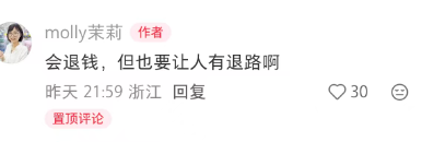 很多网友注意到,Molly还在自己视频的评论区发了一句耐人寻味的话:“会退钱,但也要让人有退路。”但她并未详细解释。