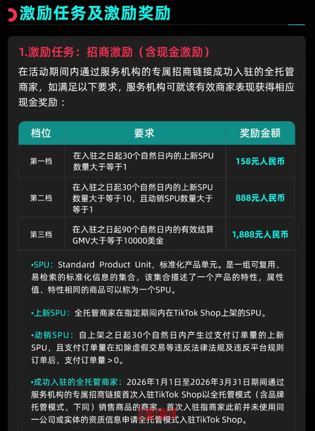招募期间,通过服务机构专属招商链接成功入驻的全托管商家,若达到规定的上新SPU数量及动销SPU数量要求,服务机构即可获得相应档位的现金激励。奖励机制共设三档,且可叠加获取,最高可达千元人民币现金奖励。