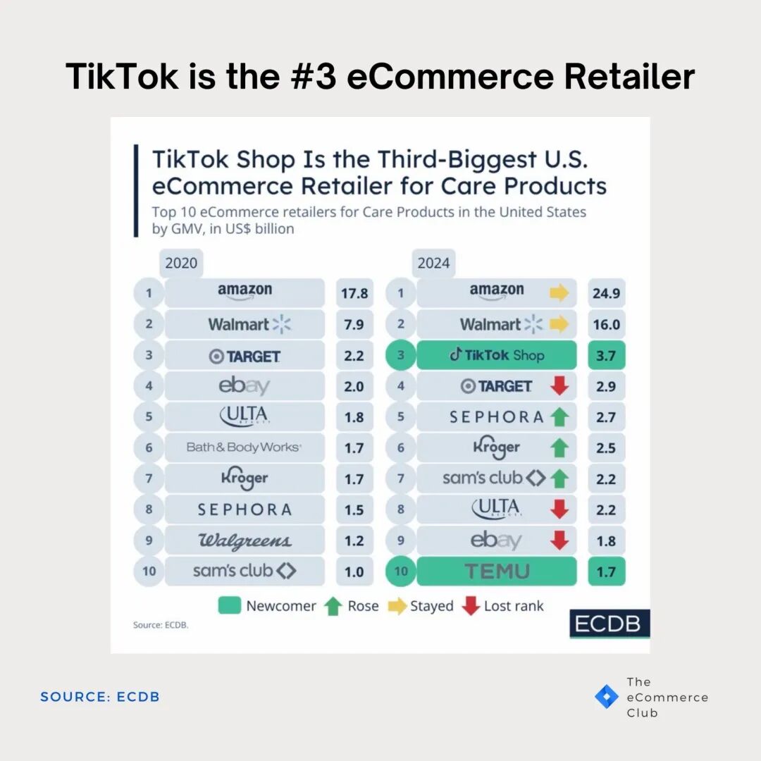 来自 ECDB 的最新数据表明:美国护理类(Care)产品的前3大电商平台,分别是 Amazon,Walmart,和TikTok Shop。Amazon 和 Walmart可以说是遥遥领先,TikTok Shop异军突起。这三大平台,足以让任何做消费品出海品牌的卖家,好好思考未来一年的布局。