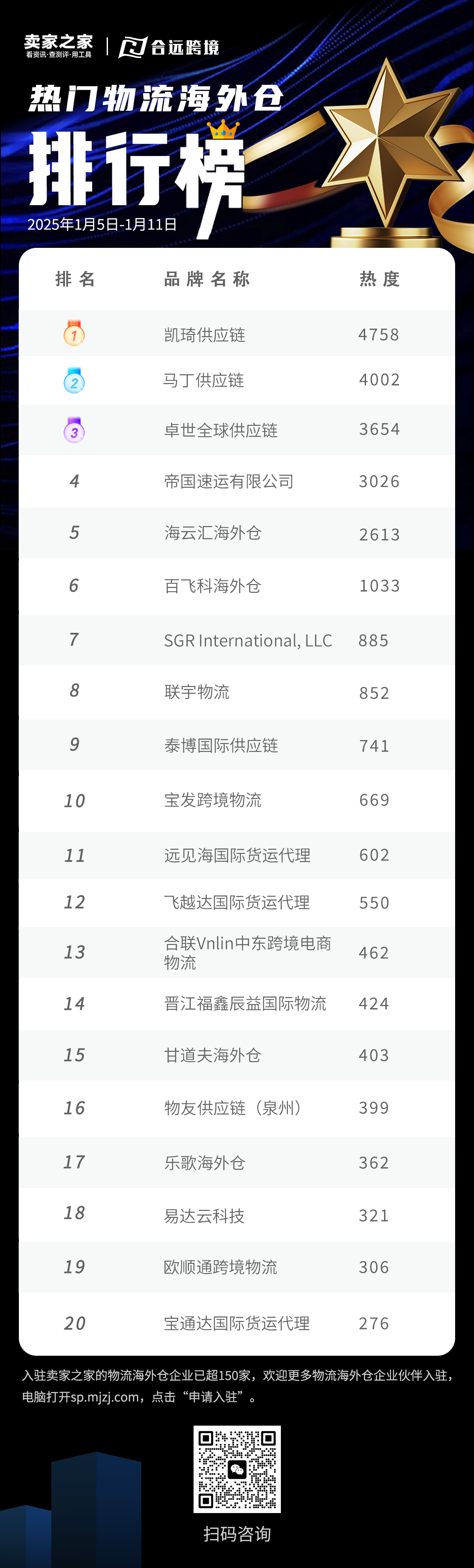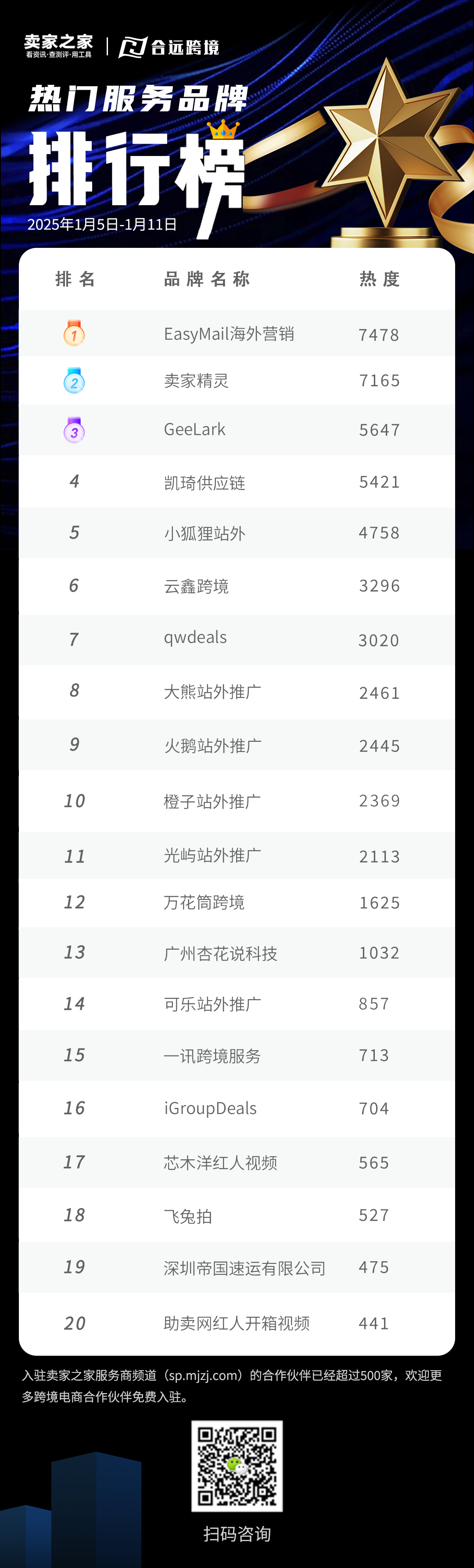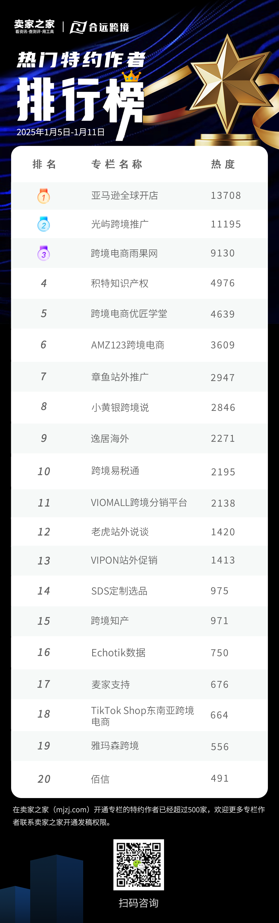 一起来揭晓本周“卖家之家热门服务品牌排行榜”、“卖家之家热门特约作者排行榜”、“物流海外仓排行榜”!(统计周期为2026年1月5日至2026年1月11日)