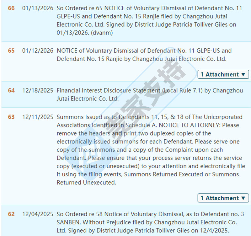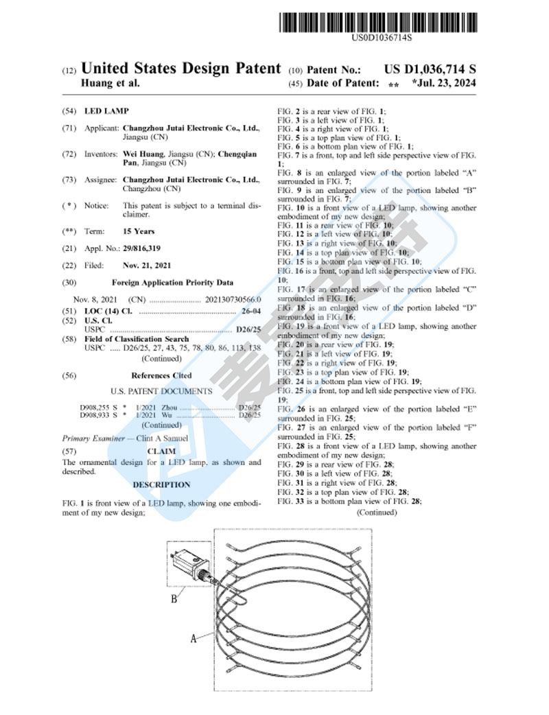 本案是Dnl Zito Castellano PLLC代理Changzhou Jutai Electronic Co. Ltd于10月1日在美国弗吉尼亚州东区法院发起的专利维权案件,前期案件处于匿名状态,所以案件细节暂未披露。经排查,原告在美国共注册有11个外观专利,涵盖电源适配器、LED控制器以及LED灯等,本次维权主要针对其于2024年7月23日获得美国外观专利认证的专利号为D1036714的LED灯发起,共有19名被告涉案,但涉案链接高达307个!灯具类卖家需注意规避,避免后续侵权被TRO冻结的风险!