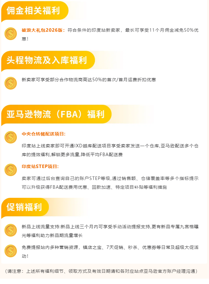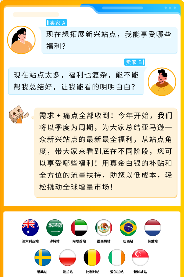 除了大家熟悉的新卖家大礼包和亚马逊物流新品入仓优惠计划,各新兴站点专享福利,怎么能错过?我们将为大家按照不同主题对福利进行全方位梳理和总结。