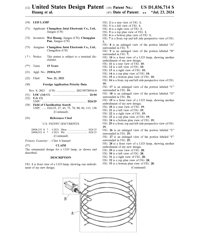 19名被告,涉案链接高达307条,涉及名为LED lamp的美国外观专利,专利号USD1036714S,2021年11月21日申请,2024年7月23日下证: