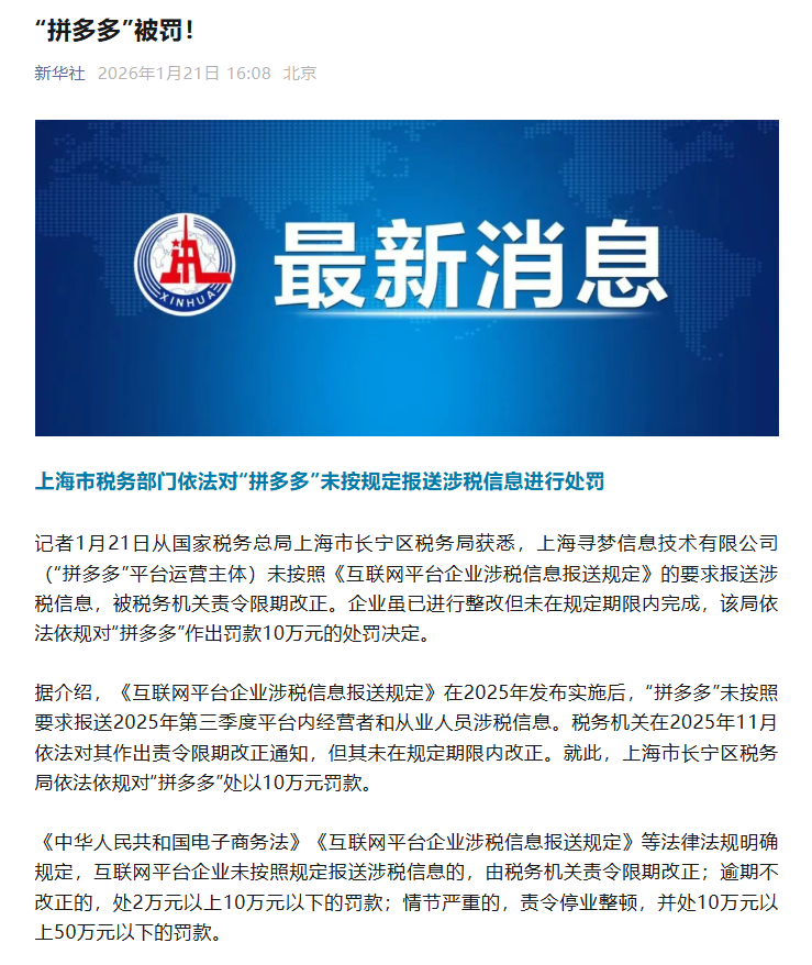 上海市税务部门依法对“拼多多”未按规定报送涉税信息进行处罚