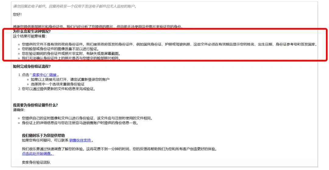 在完成“拍摄您的面部照⽚”或“录制您的⾯部视频”后,如果亚⻢逊无法基于您提交的照⽚或视频完成身份验证,那么您会收到⼀封来自亚马逊的邮件,说明⽆法完成身份验证的可能原因,并通知您重新完成身份验证。请您按照邮件指示,登录到亚⻢逊卖家平台,再次完成⾝份验证。