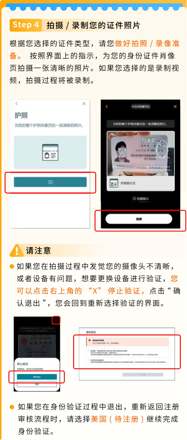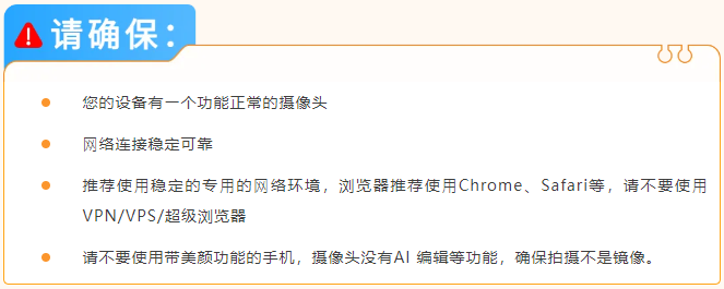 (2)若选择“录制您的⾯部视频”,屏幕上会显示相关说明。这些说明会引导您在⽹络摄像头前展示证件以及您的⾯部