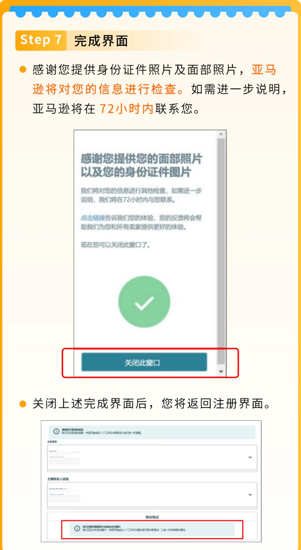 在完成“拍摄您的面部照片”或“录制您的面部视频”后,亚⻢逊的卖家身份验证团队将审查所有信息和文档,此过程通常需要2-5个工作日。请于2-5个工作日后登录卖家平台,检查您是否可以访问卖家平台主⻚。
