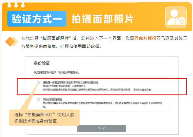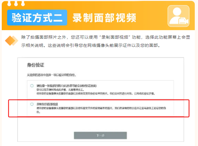身份资料提交完成之后,接下来正式进入身份验证的环节,亚马逊为您提供两种身份验证方式 —— 拍摄面部照片、录制面部视频。您可以根据⾃⾝情况,⾃由选择其中一种: