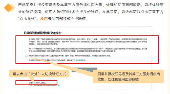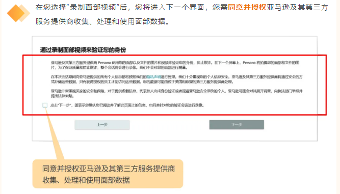 若您同意并授权亚⻢逊及其第三⽅服务提供商使⽤您的⾯部以及⽂件的图⽚和视频来验证您的⾝份,您将体验以下新的验证流程。