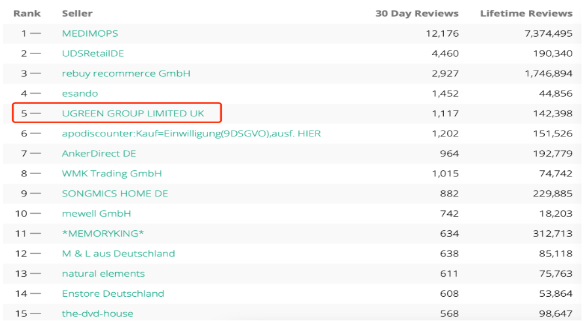 根据SellerRating最新发布的亚马逊店铺排名,绿联科技旗下品牌Ugreen已成功进入欧洲市场3C类目中最受关注的品牌,排名进入前15名,其中在亚马逊欧洲最大站点——德国站的表现尤为突出,店铺排名高居第5;此外还在法国站排名第7、西班牙站排名第8、英国站排名第12、意大利站排名第14,充分展示了其在欧洲市场的强大实力。