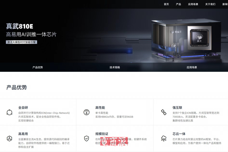 官网介绍显示,“真武810E”采用自研并行计算架构和片间互联技术,配合全栈自研软件栈,实现软硬件全自研。其内存为96G HBM2e,片间互联带宽达到700 GB/s,可应用于AI训练、AI推理和自动驾驶。阿里已将“真武810E”大规模用于千问大模型的训练和推理,并结合阿里云完整的AI软件栈进行深度优化,为客户提供一体化产品和服务。