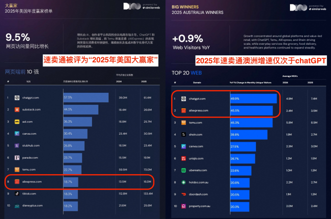 在美国,速卖通2025全年网站访问量同比增长18.7%,成为美国增速最快的十大平台之一,被评为“2025年美国大赢家”。美国市场亚马逊、沃尔玛、Target等本土零售巨头长期占据主导地位,新兴平台突围难度极高,取得这一成绩可谓不易。