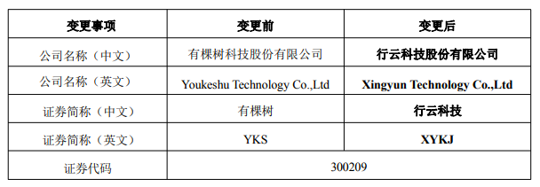 2026 年 2 月11 日,公司全称由“有棵树科技股份有限公司”变更为“行云科技股份有限公司”,公司证券简称由“有 棵树”变更为“行云科技”,证券代码保持不变,仍为“300209”。