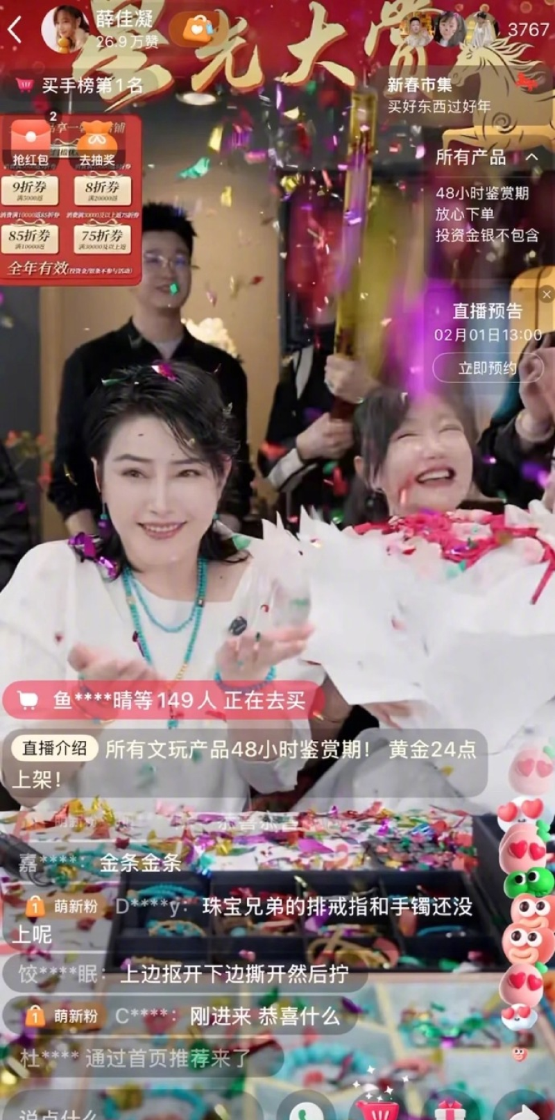 1月31日,演员薛佳凝在小红书开播,带货文玩珠宝销售额破亿,彼时全场喝彩。
