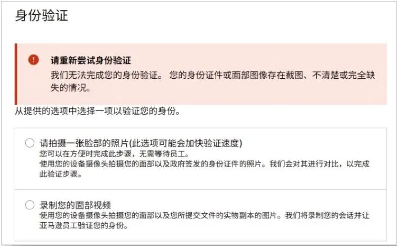 在完成“拍摄您的面部照⽚”或“录制您的⾯部视频”后,如果亚⻢逊无法基于您提交的照⽚或视频完成身份验证,那么您会收到⼀封来自亚马逊的邮件,说明⽆法完成身份验证的可能原因,并通知您重新完成身份验证。请您按照邮件指示,登录到亚⻢逊卖家平台,再次完成⾝份验证。
