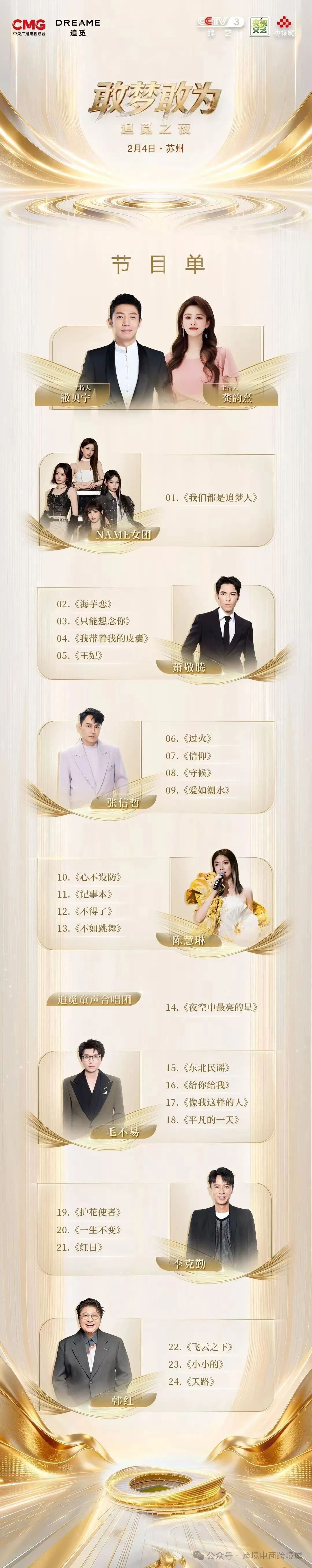 从朋友圈小伙伴晒出的图片来看,追觅这场演唱会时间正是2026年2月4日,在苏州奥林匹克体育中心,是和总台央视联合打造的全明星演唱会,歌星阵容包括韩红、李克勤、陈慧琳、张信哲、萧敬腾、毛不易,可谓是科技碰撞音乐,热爱奔赴舞台。