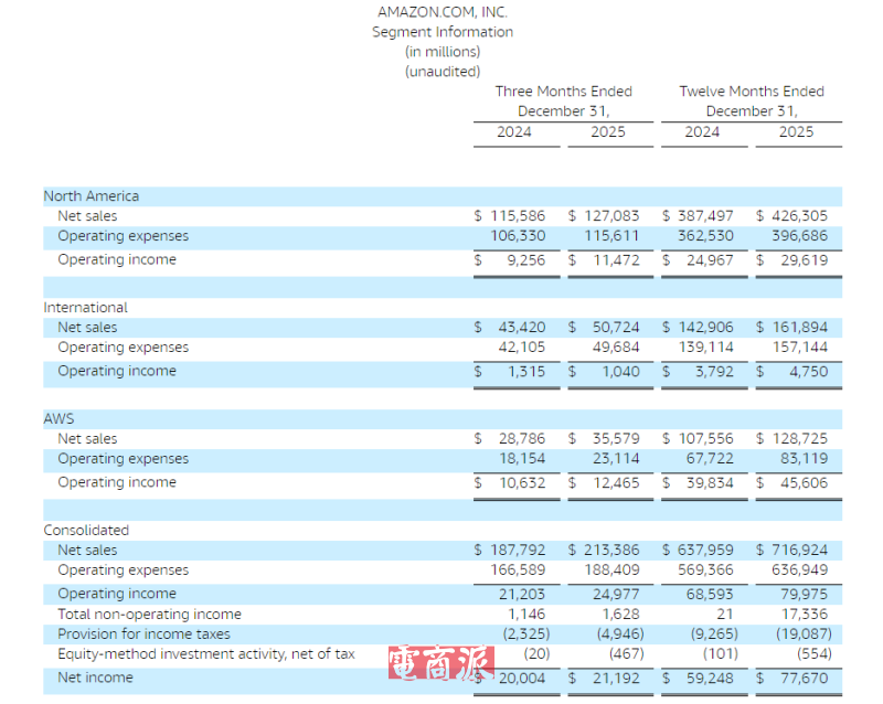 2025年全年,亚马逊北美地区销售额同比增长10%,达到4263亿美元,营业利润为296亿美元;国际业务销售额同比增长13%至1619亿美元,营业利润为47亿美元;AWS业务部门销售额同比增长20%,达到1287亿美元,营业利润为456亿美元。