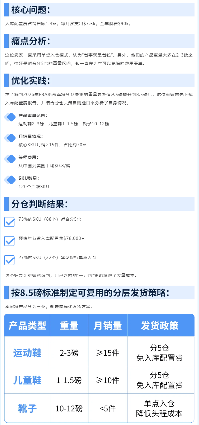 根据2026年最新费率,亚马逊更新了分仓决策的重量参考值: