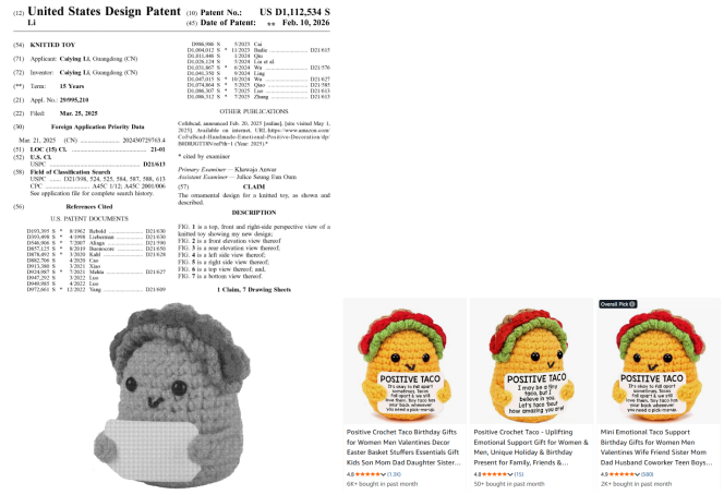 2月10日美国专利局公布一批最新下证美国外观专利,其中包含不少热销产品,比如在亚马逊上月销8K+且有大量同款在售的塔可针织玩偶。