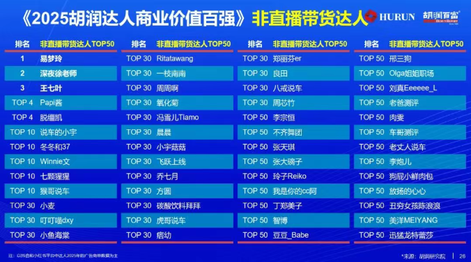 近日,胡润在此发布了《2025胡润达人商业价值百强》。李佳琦位列直播带货达人 TOP1,被外界看作最有能力与李佳琦争夺 " 带货一哥 " 头衔的董宇辉排名第二。