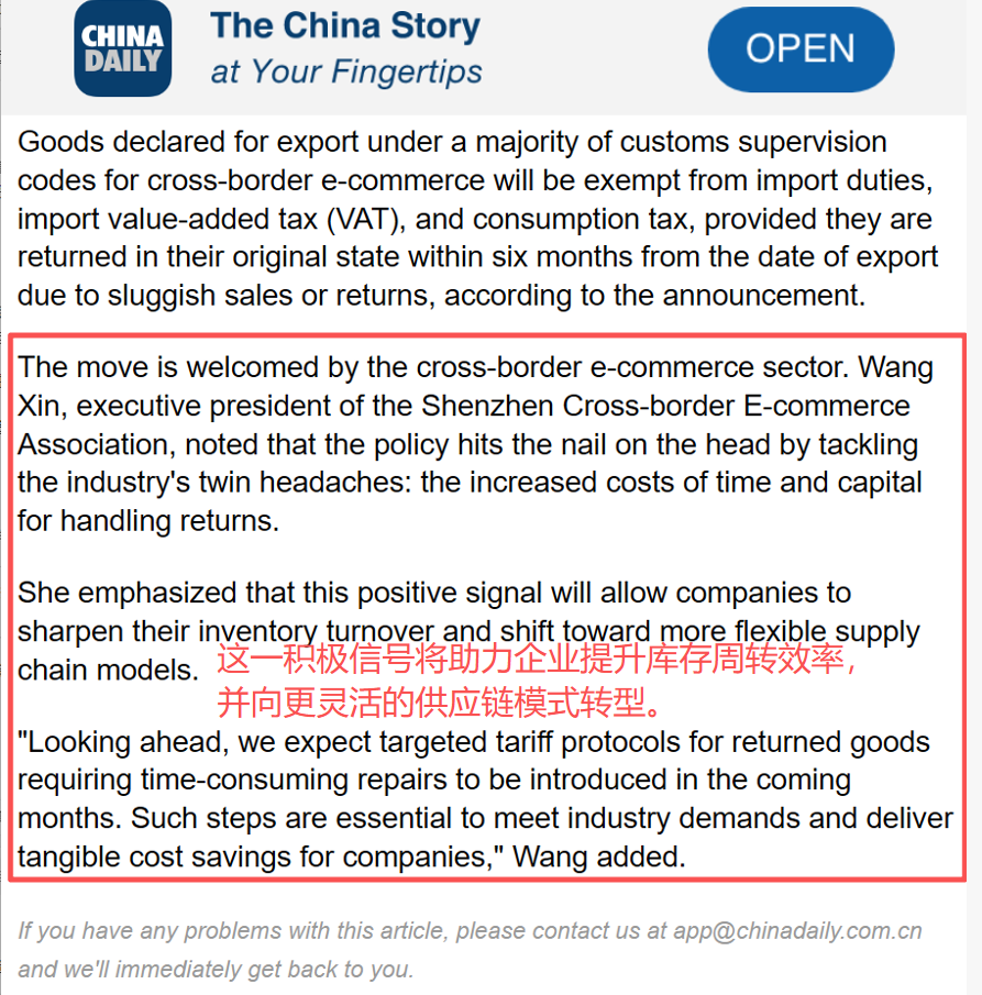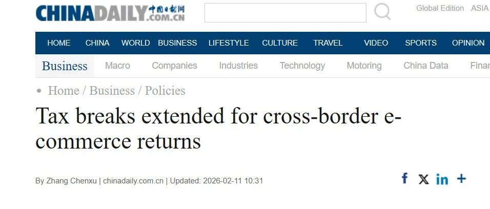 【中国日报网CHINADAILY.com.cn发布“Tax breaks extended for cross-border e-commerce returns”文章】