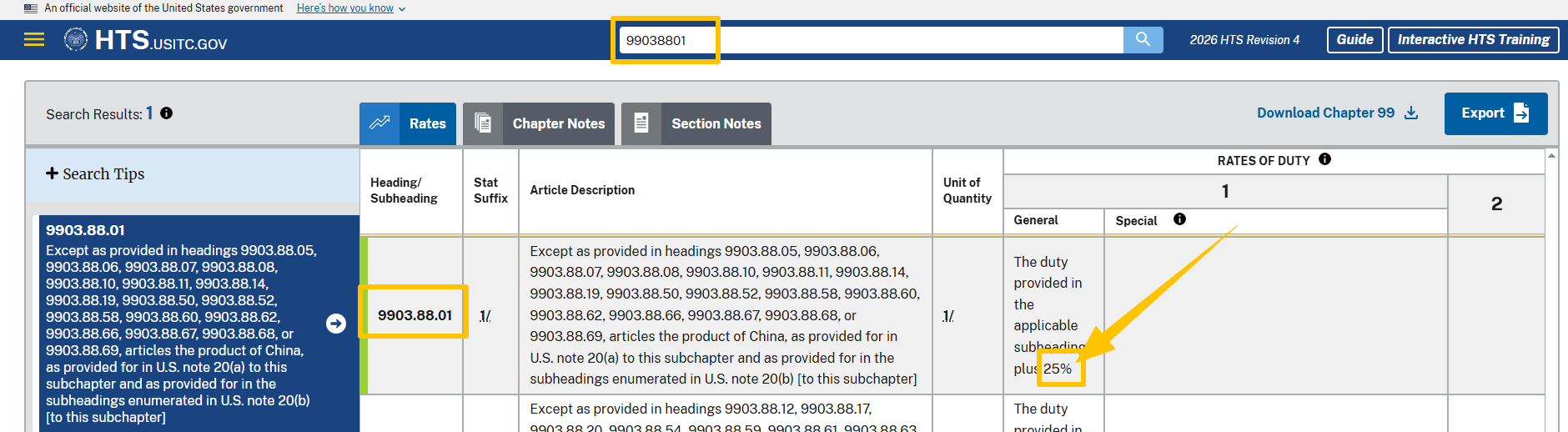 复制这个 9903.88.01,在搜索框再次查询。你会看到描述里写着“articles the product of China”,并且税率是 25%。这就是针对我们中国卖家的301关税。