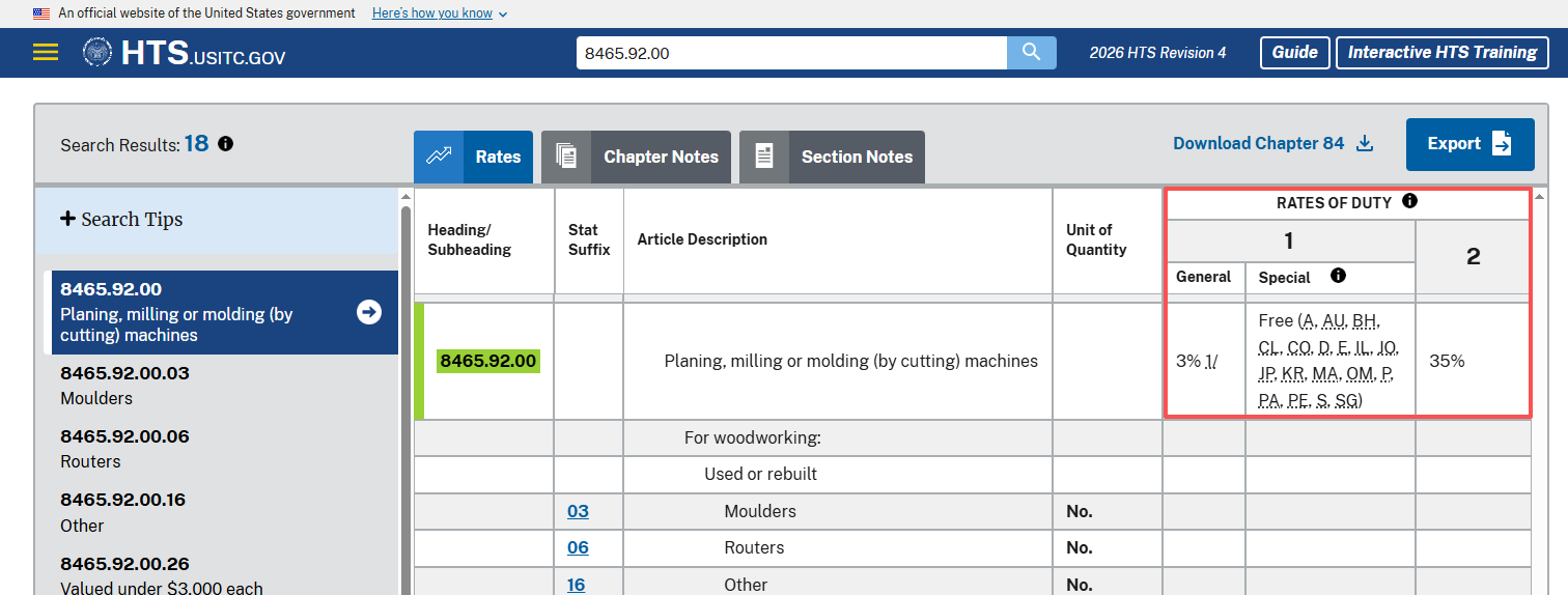 我们以 HTS编码 8465.92.00(木材加工机床)为例,实操一遍: