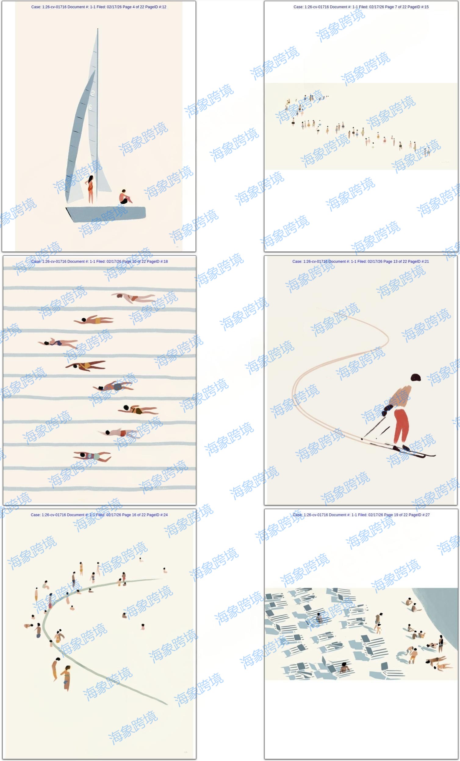 ●案件参数: 起诉时间:2026/2/17 案件号:26-cv-1716 原告品牌:Kristen Marie Boydstun 版权画 品牌方:Kristen Marie Boydstun 律所:Keith 起诉地:美国伊利诺伊州 注册版权: 原告 Kristen Marie Boydstun 是一位艺术家和插画家,擅长创作水粉画、油画棒绘画和数码绘画艺术版画。原告作品以简洁的造型、大量留白、有限的色彩以及温暖的夏日氛围为特征。 刊登实例: