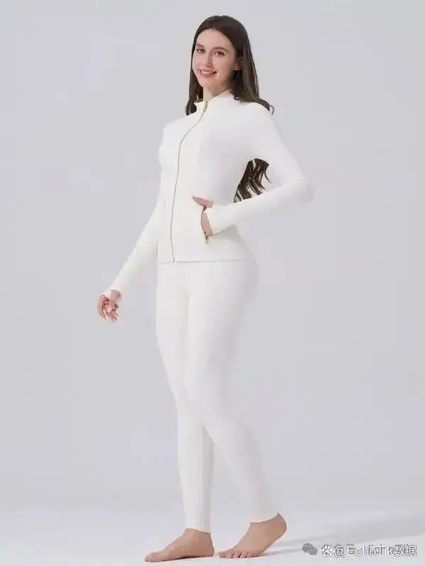 上身为金色拉链运动夹克设计,下身为25英寸紧身瑜伽裤,采用柔软刷毛面料,强调贴肤舒适感。整体剪裁偏修身路线,突出腰线与腿部线条,强化“显瘦”和“曲线塑造”效果。