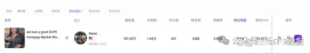 其中,带货量最高的一条视频,出自TikTok美区博主Kiani.,一条试穿测评视频,获得了180多万多播放量,带来近2000单成交。
