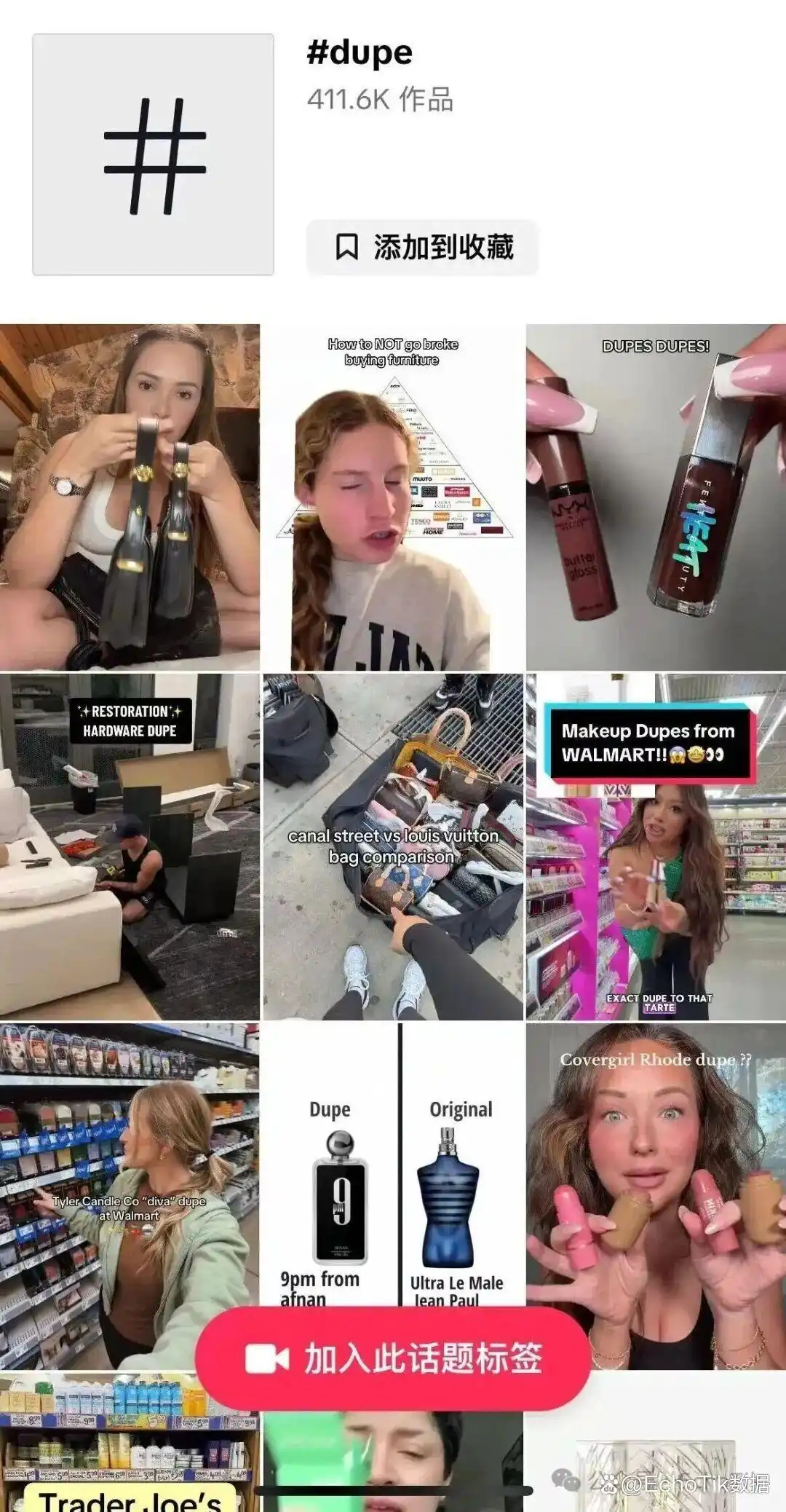 在TikTok,“找到一个好平替”,甚至变成一种值得炫耀的能力。#dupe 早已成为高频流量标签。