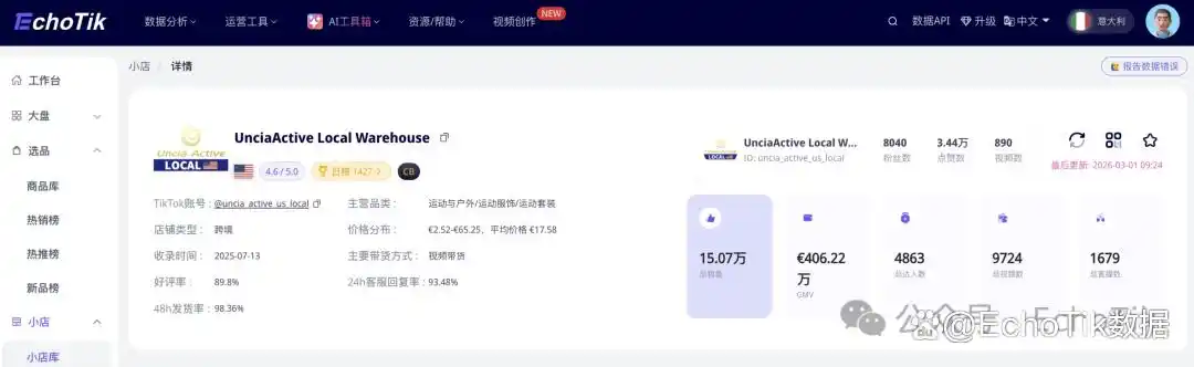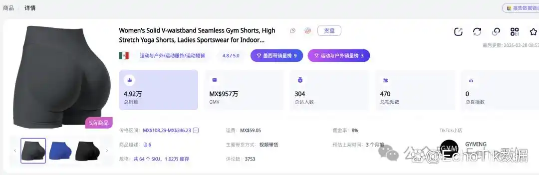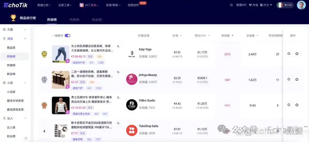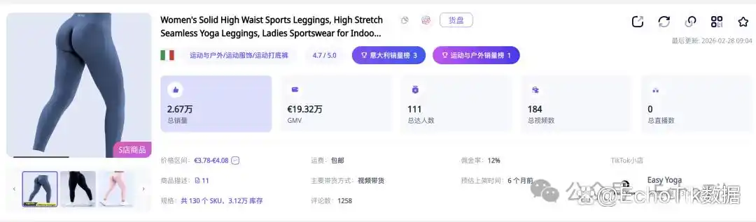 在Echotik热销榜单,有一款瑜伽裤热销欧洲多国,在意大利TikTok甚至登上了7日榜的销量第一名!增长曲线明显加速。