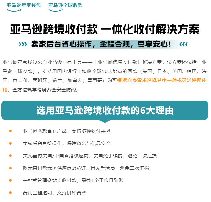 作为亚马逊自有收付款工具,卖家钱包把收款与付款放在卖家后台统一完成,无需跳转第三方平台或反复授权操作,减少外部环节带来的信息暴露与资金风险,让您的店铺信息与资金管理更加安全可靠。