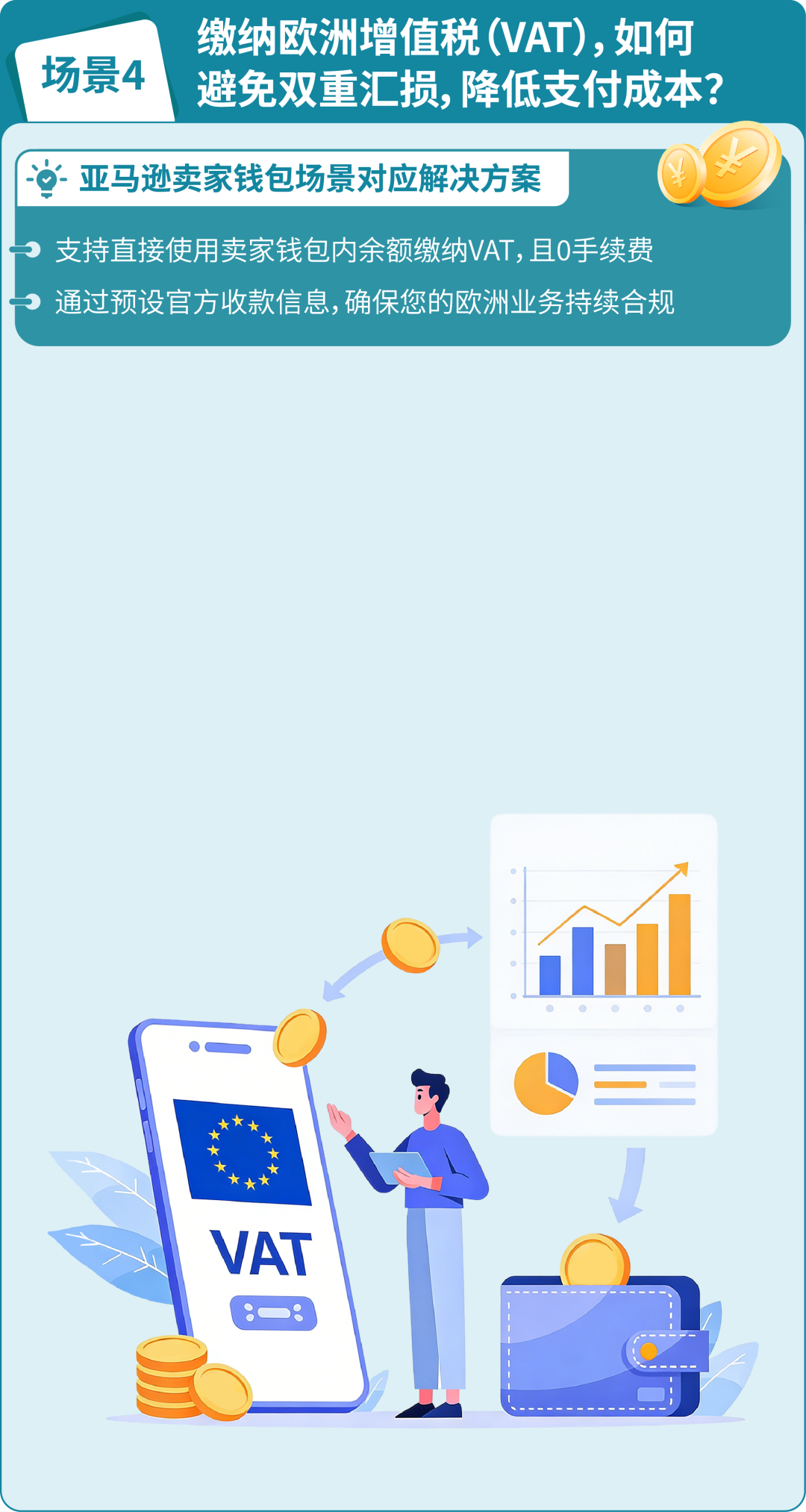 使用卖家钱包,您可以将当地货币储存在卖家钱包中,并直接使用钱包内的余额缴纳 VAT,而且0手续费。助力轻松实现税务合规的同时,通过卖家钱包还可以直接向欧元区供应商付款,避免“欧元→人民币→欧元”的多次换汇,实现0汇损。